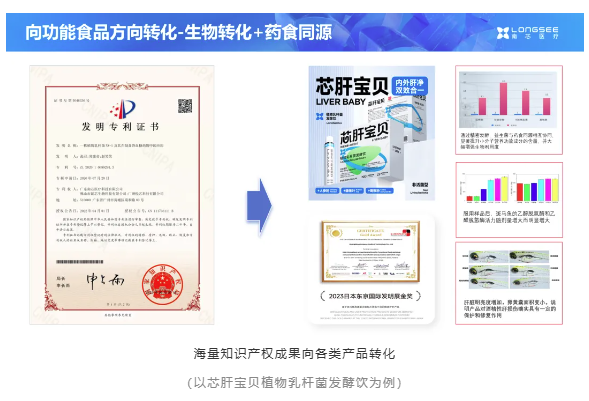 南芯医疗依托生物制造共性关键技术平台,全面促进专利的成果转化。企业在活体生物药(1类创新药)、特医食品(“迈凯微”系列)、功能食品(“芯肝宝贝”、“轻盈无忧”、“芯飘零”等药食同源系列)、微生物技术(“微生物质谱检测系统”)和微生态疾病预警模型等领域都有相应优秀成果转化。海量知识产权成果,全面助力生物制造底座的新质生产力构建及产业化。