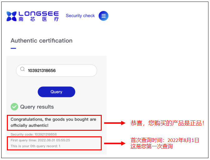 点击查询后,将显示产品正品相关信息,并提示该产品此前累计被查询的次数信息。